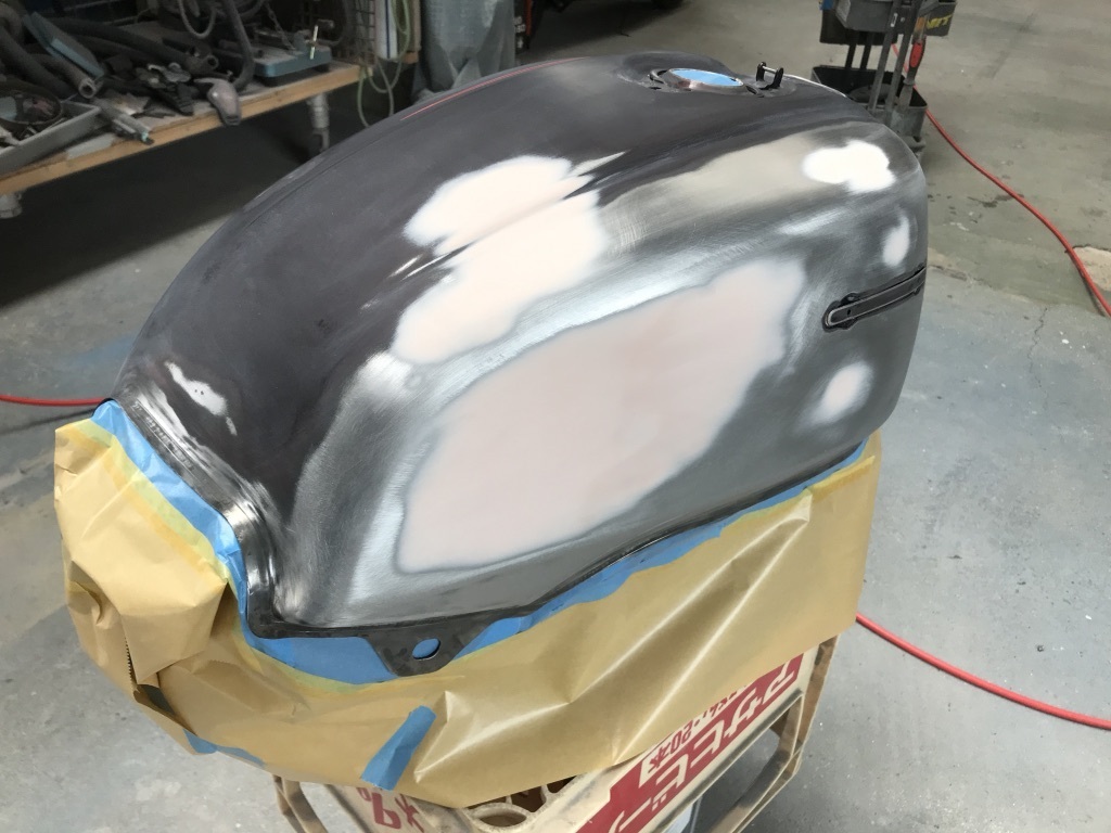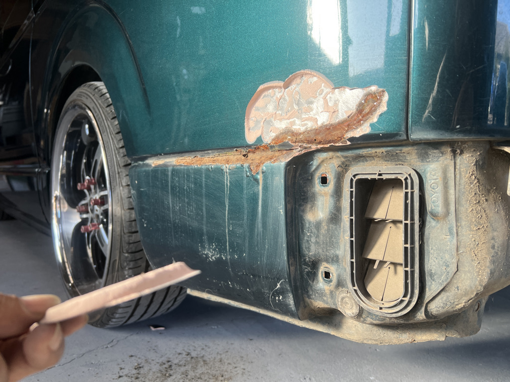 以前の鈑金修理時に脱脂などが十分にされてないと鉄板に付いた水分と反応して錆が出ますパテの厚みが厚ければ厚いほど症状は出にくいのですが・・・出てきてしまうと大変な事になる事が多いです、施工時の予算にもよりますが意外と低予算の方が鈑金屋さんは大変!なこともあります。今回もその大変な事に!